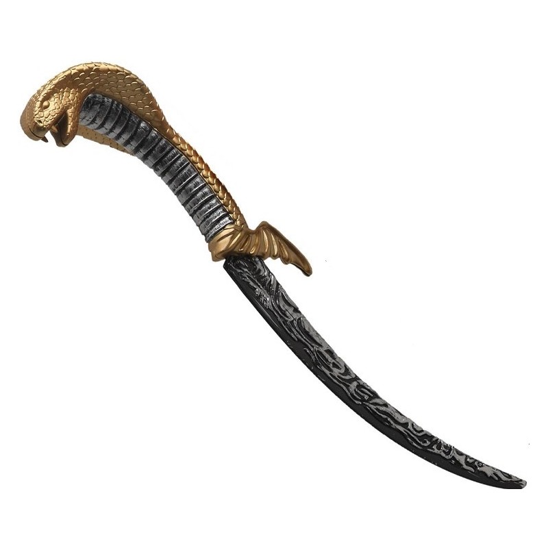 1 dague en plastique de 40cm de long, le manche représente un serpent cobra doré, et la lame est argentée