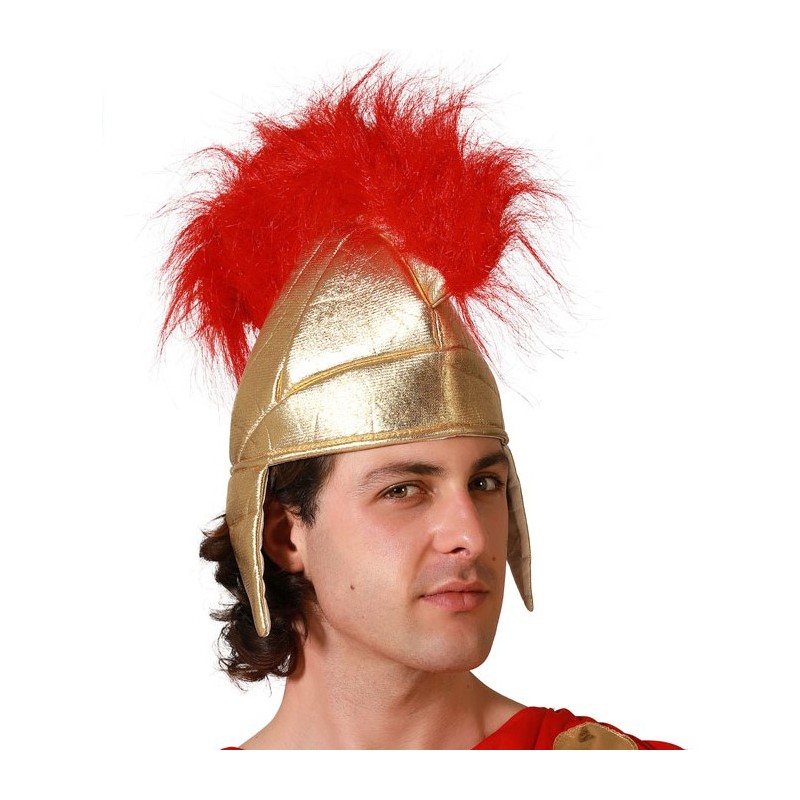 Voici un Casque en tissu lamé doré avec sa grande crête en poil rouge qui vous permettra de compléter un Déguisement pour Homme ou Femme de Guerrier ou Centurion Romain !