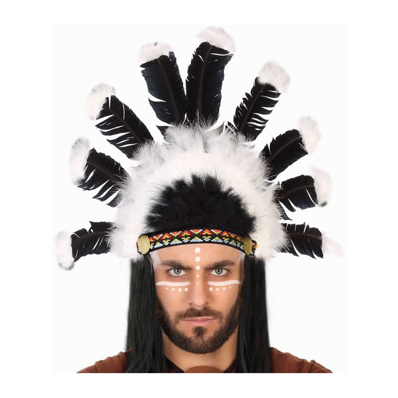Voici une magnifique coiffe de Chef Indien avec des plumes noires et blanches. Avec cette coiffe de très belle qualité vous serez le prochain Grand Guerrier de votre carnaval ou fête déguisée sur le thème du cowboy et du western !