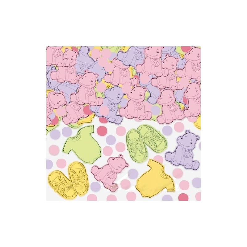 Pour le baptême de votre fille, parsemez votre table de ces jolis confettis en plastique représentant des bodys, chaussons et hippopotames. Comprenant environ 250 confettis déclinés en vert pastal, jaune, rose et violet