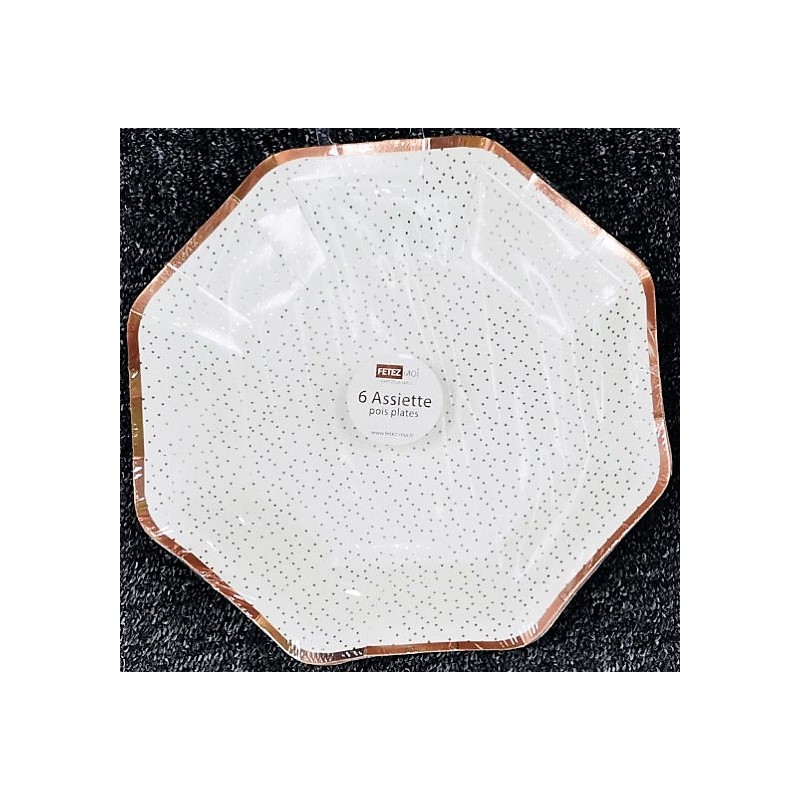 Lot de 6 Assiettes octogonales en carton blanc avec décor de petits pois de couleur rose gold