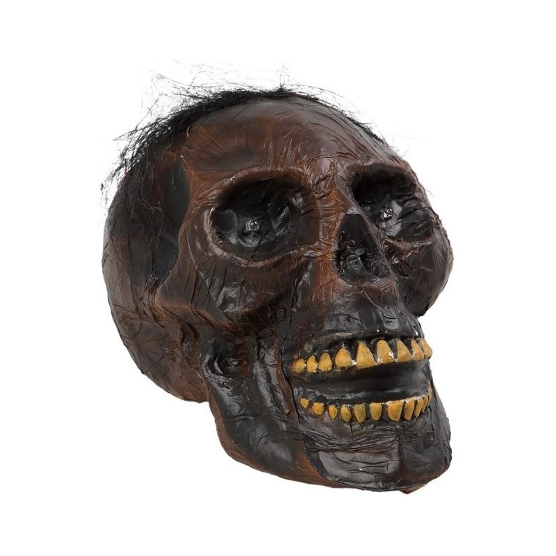 Ce crâne humain de tête de mort est de couleur marron avec un reste de cheveux noirs et des yeux qui s'illuminent, il fera peur lors de votre fête Halloween !