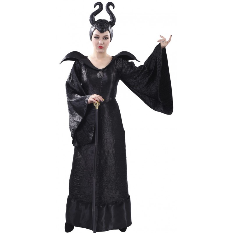 La tenue comprend une Robe en tissu satiné noir aux manches très évasées avec sa Coiffe chapeau avec ses grandes cornes.