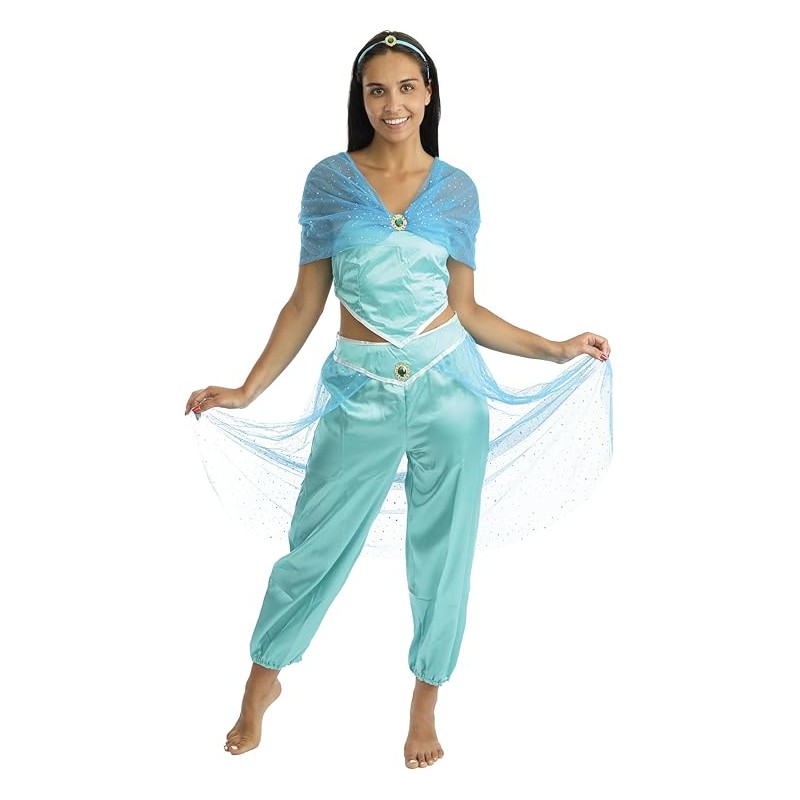 Transformez-vous en Princesse Orientale et devenez un personnage de Dessin Animé tel "Jasmine" dans "Aladin" avec ce magnifique Déguisement. Cette tenue se compose d'un Haut en satin et voile bleu, d'un Pantalon en satin bleu avec Voile, et d'un Bandeau pour les cheveux.