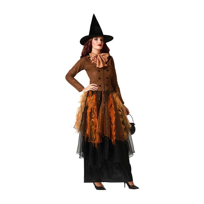 Ce costume comprend une longue Robe longue avec de la suédine marron, du satin noir et des froufrous noir, orange et marron irisés, un Chapeau pointu et un long Foulard avec de réaliser un gros noeud au cou.