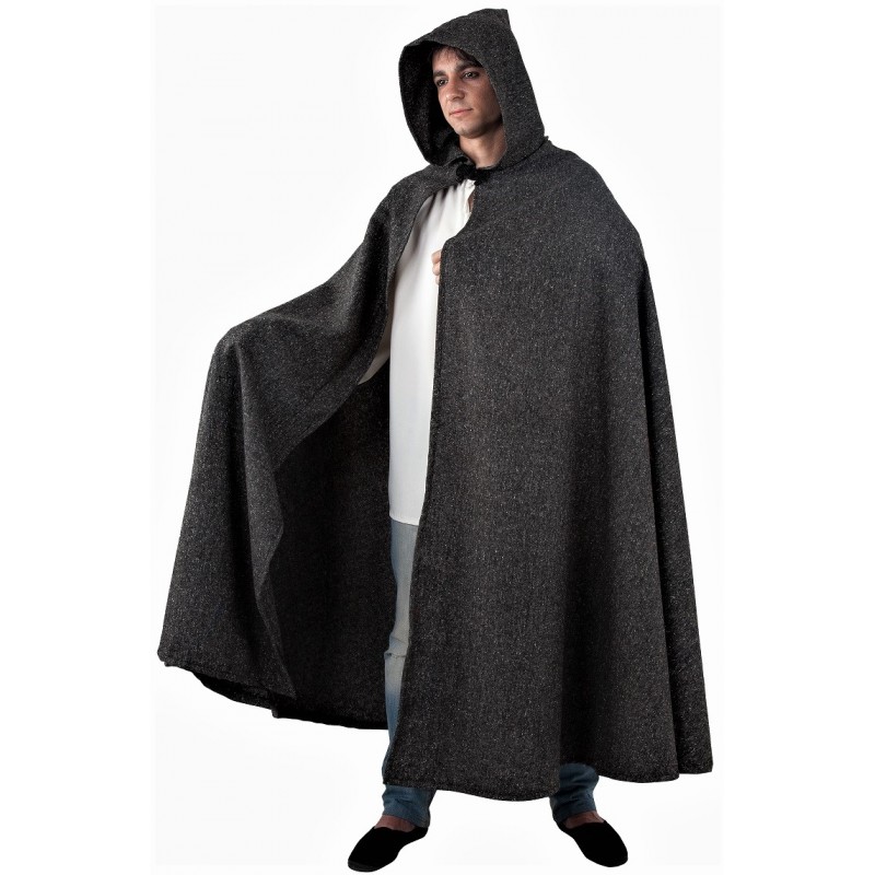 Cette Cape est fabriquée dans un tissu de Haute Qualité en Espagne. De couleur gris foncé avec sa capuche, elle vous permettra de vous protéger du froid lors de vos fêtes médiévales. Elle est composée de 90% de polyamide et de 10% d'autre fibre, son poids est de 1,5 kg.