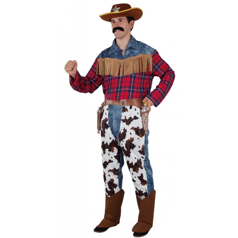 Ce Costume, réalisé dans des tissus de haute qualité, se compose d'une véritable chemise à carreau rouge, franges et jean bleu, de son pantalon en jean et feutrine peau de vache et de sur-bottes en feutrine très épaisse marron.