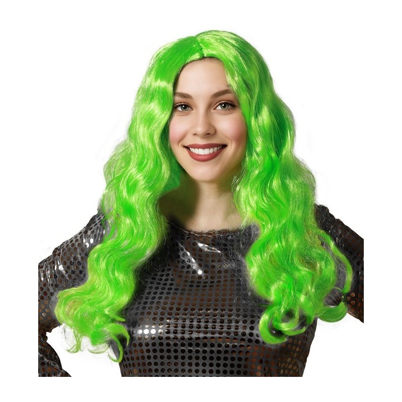 Cette Perruque à des cheveux longs qui sont ondulés et bouclés et sont de couleur vert intense.