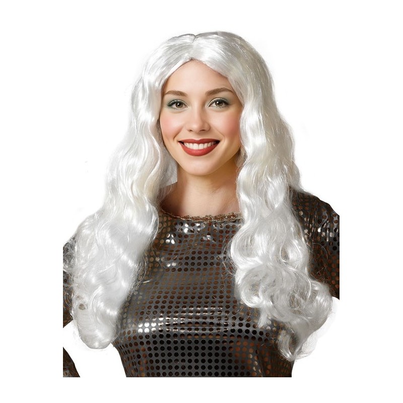 Cette Perruque à des cheveux longs qui sont ondulés et bouclés et sont de couleur Blanc brillant.