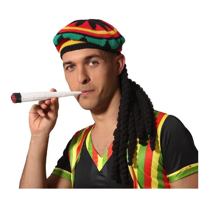 Afin de compléter votre Déguisement Hippie ou Jamaïcain, voici un chapeau casquette en laine avec sa perruque aux cheveux noir en forme de rasta dreadlocks avec un Pétard Joint. Vous complèterez un Déguisement de Bob Marley !