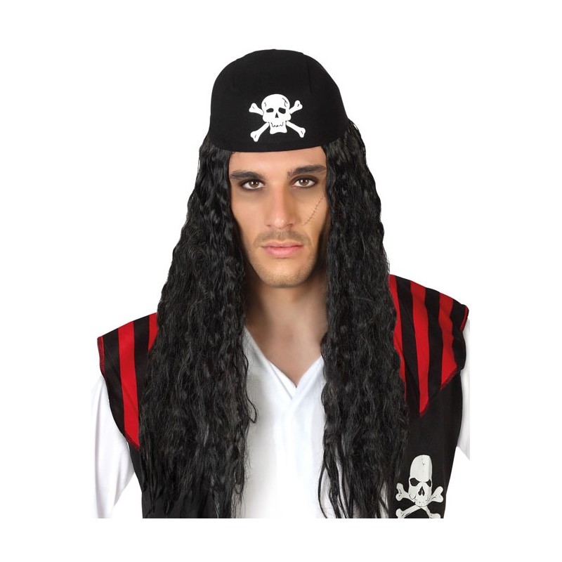 Cette Perruque aux cheveux longs ondulés noirs avec son Bandeau sera un complément pour votre Déguisement de Pirate. Vous pourrez l'utiliser sans le bandeau !